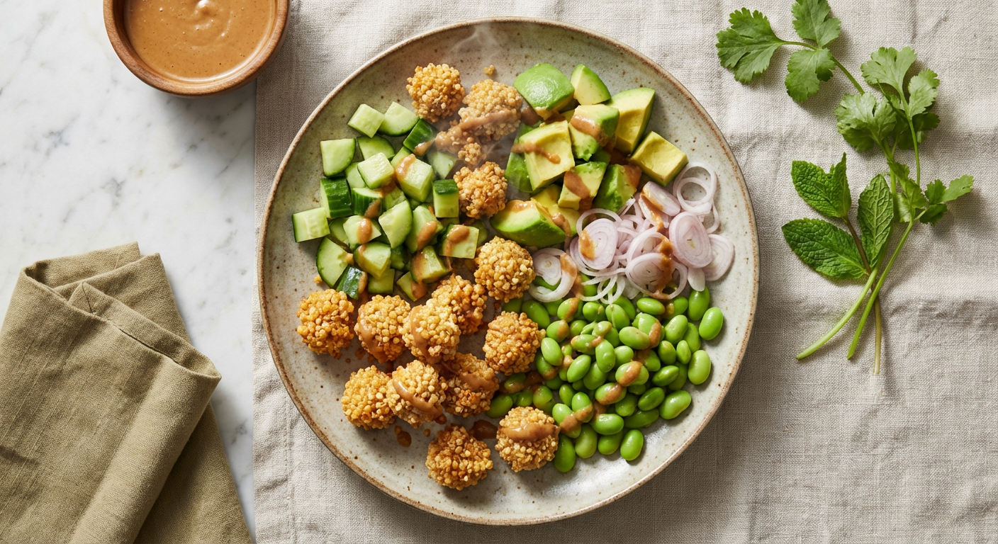 A vibrant and satisfying salad featuring irresistibly crispy baked quinoa, fresh vegetables, and protein-packed edamame. A creamy, savory-sweet peanut dressing ties everything together for a delightful crunch in every bite.